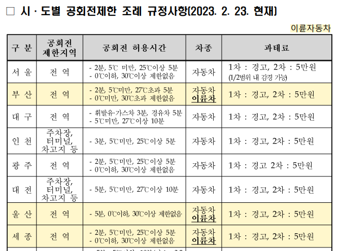 자동차의 엔진을 켜둔 상태로 운행하지 않고 공회전하면 미세먼지 배출 등 환경에 좋지 않기 때문에 정부에서 과태료를 부과합니다. 단속에 해당하는 공회전 제한 장소는 시·도별로 다르지만, 보통 주차장이나 터미널, 차고지, 학교환경위생 정화구역 등으로 정해져 있는데요. 서울, 부산, 대구, 광주, 울산, 세종시의 경우에는 시내 전 지역이 공회전 제한지역입니다. 일부 장소에는 공회전 금지 지역이라는 표시가 되어 있어서 사전 경고 없이 즉시 단속하는 곳이 있습니다. 대부분은 1차는 경고, 2차 적발 시에는 5만 원의 과태료가 부과됩니다.