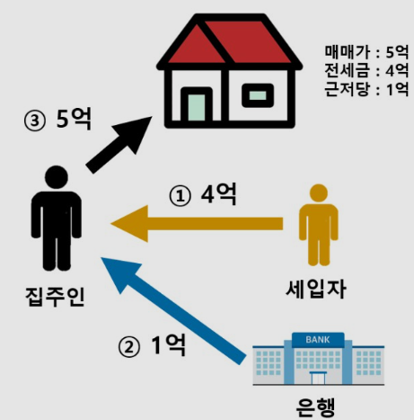 먼저 '갭투자'라는 게 뭐냐 하면 부동산을 매입하기 전, 전세세입자를 먼저 구하고 전세보증금을 받은 뒤에 남은 차액만큼 대출을 받아 부동산을 매입하는 것을 뜻합니다. 예를 들면 매매가 5억 원, 전세가 4억 원인 부동산이 있다면 전세세입자를 먼저 구해 전세보증금으로 4억을 받고 나머지 1억은 대출을 받아 부동산을 매입하는 겁니다. 이렇게 되면 내 돈 1억 원만 들이고도 5억짜리 부동산을 매입할 수 있는 거예요. 갭투자는 기본적으로 부동산 가격이 오르면 성공적인 투자가 됩니다. 4억짜리 전세 세입자를 끼워 넣어 대출 1억 원으로 매매가 5억짜리 부동산을 매입했는데 집값이 올라 매매가가 8억 원이 됐다면 그럼 1억 원의 투자금으로 3억의 수익을 올리게 된 겁니다. 그런데 문제는 집값이 떨어질 수도 있다는 겁니다. 그렇게 되면 당연히 전세 세입자에게 돌려줄 4억이 없으니까 집이 경매에 넘어가게 되죠. 그러면 부동산 가격이 떨어졌으니까 경매 낙찰가는 처참하게 낮아질 수밖에 없고 그마저도 은행 근저당이 세입자보다 먼저이기 때문에 얼마 안 되는 낙찰가가 은행으로 먼저 지급되기까지 합니다. 그러니까 전세 계약을 하기 전에 등기부등본에 있는 근저당 꼭 잘 확인하시고 갭투자와 같은 깡통전세는 웬만하면 피하는 게 좋습니다.